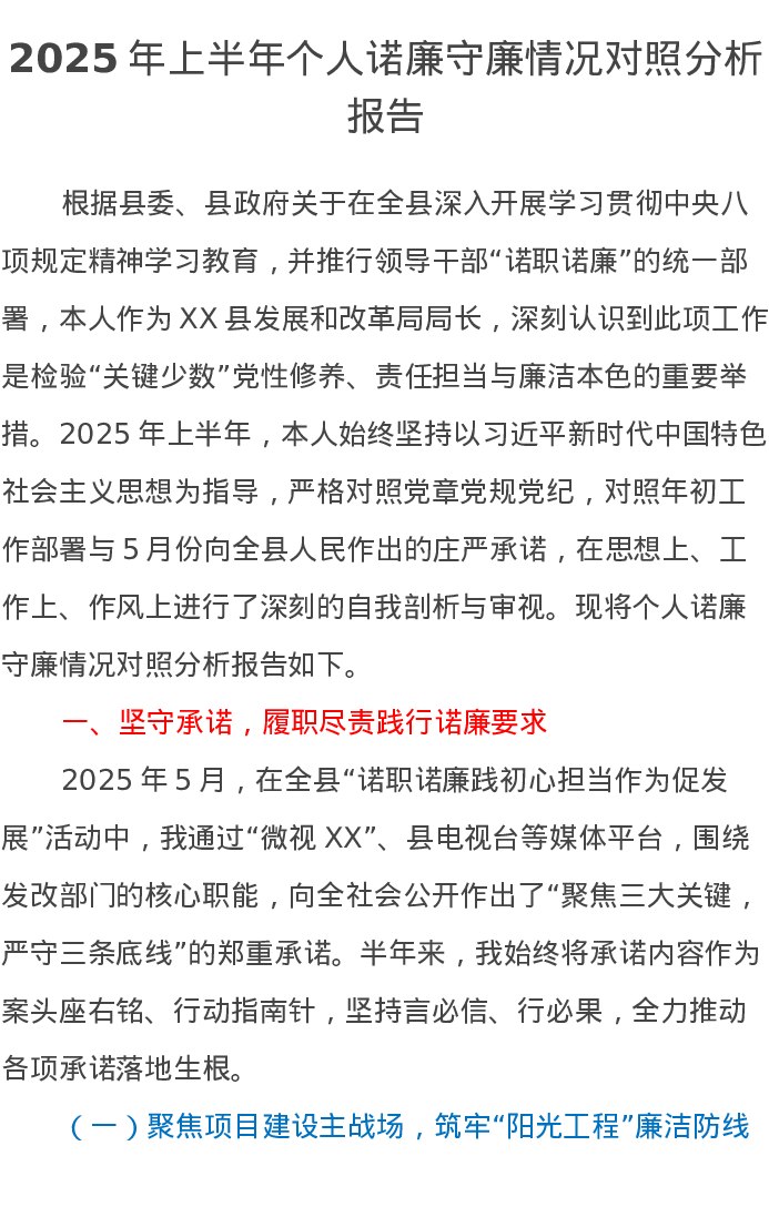 2025年上半年个人诺廉守廉情况对照分析报告