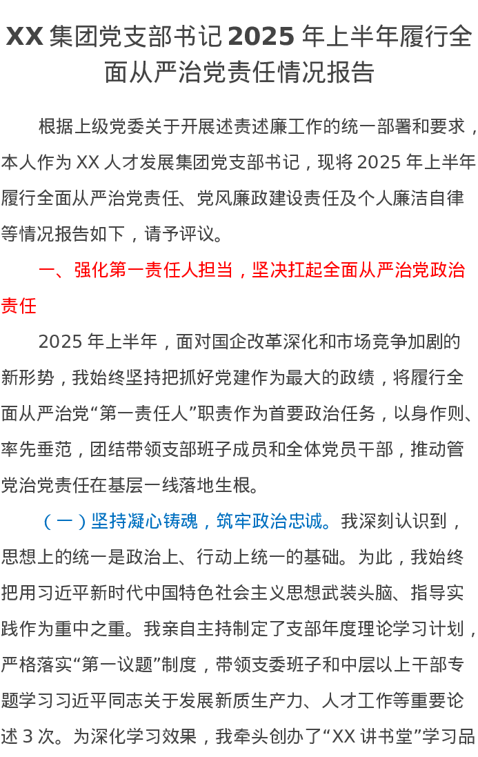 XX集团党支部书记2025年上半年履行全面从严治党责任情况报告
