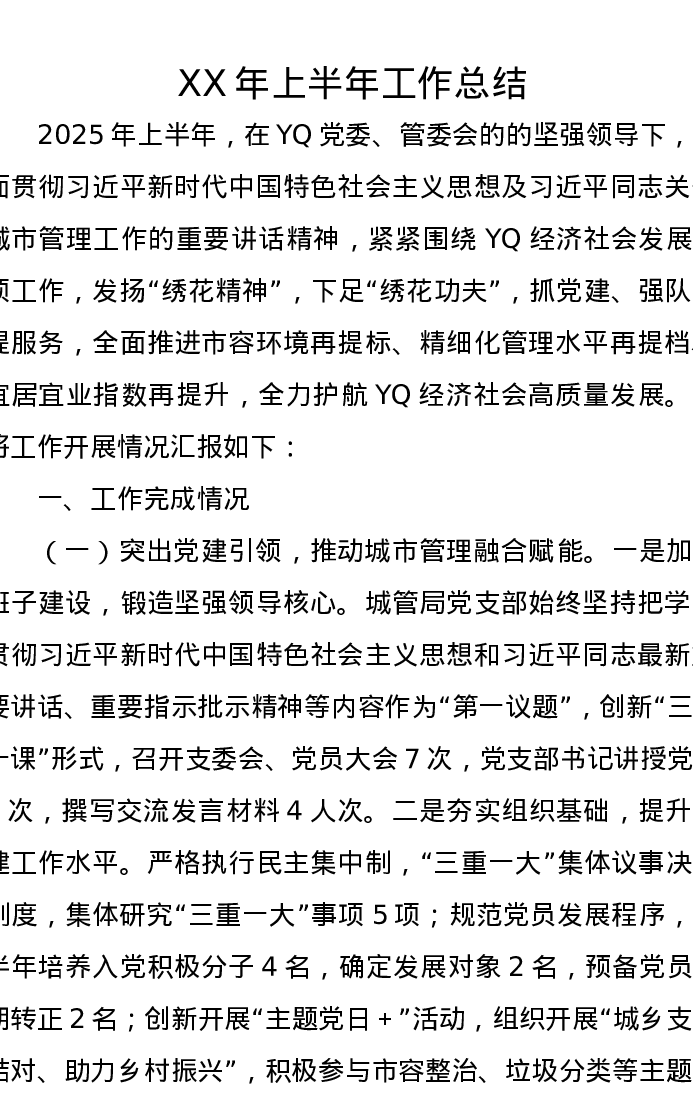 XX市XX区城管局某年上半年工作开展情况总结报告