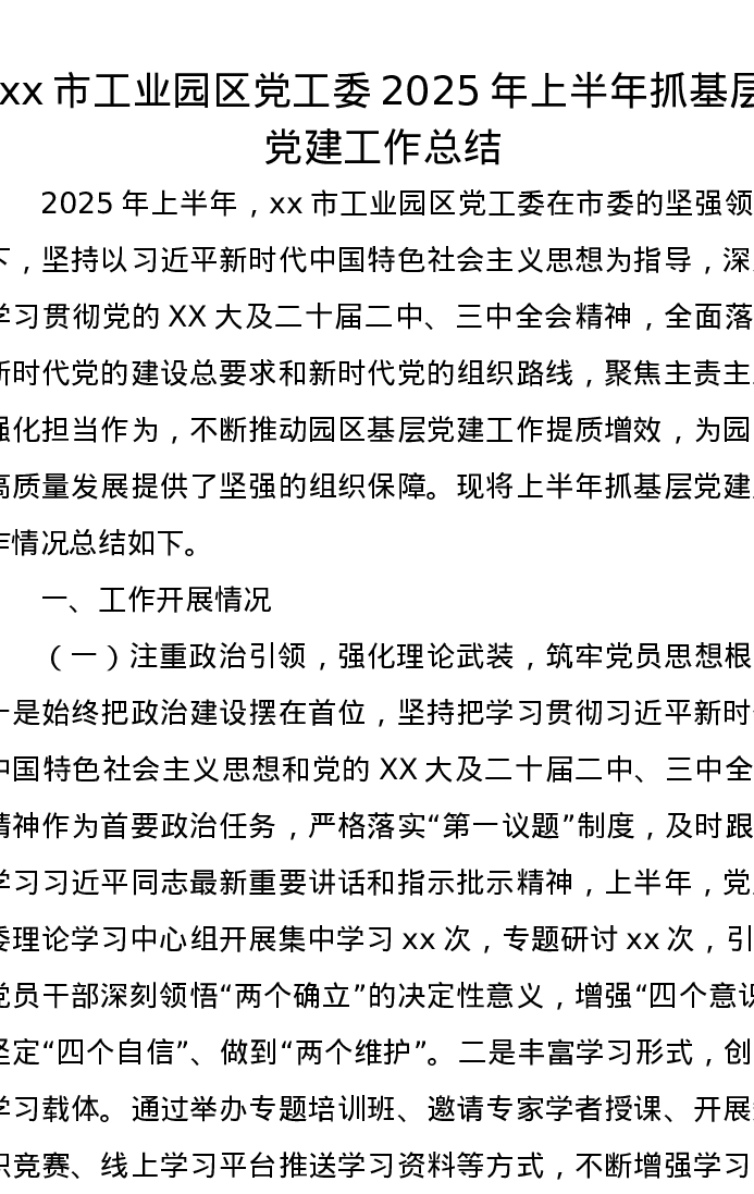 xx市工业园区党工委2025年上半年抓基层党建工作总结