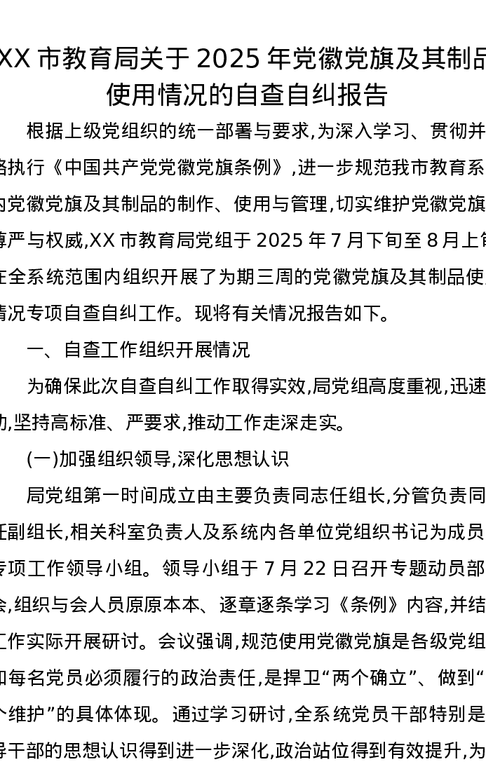 XX市教育局关于2025年党徽党旗及其制品使用情况的自查自纠报告