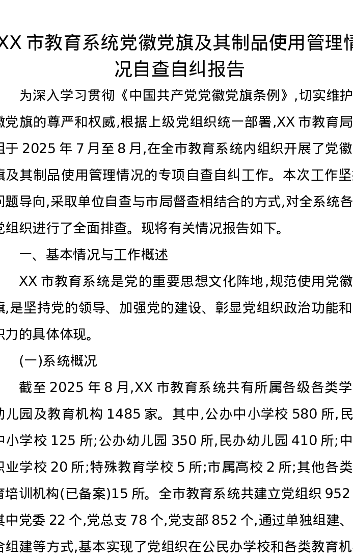 XX市教育系统党徽党旗及其制品使用管理情况自查自纠报告