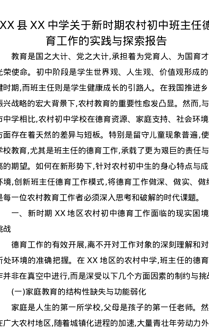 XX县XX中学关于新时期农村初中班主任德育工作的实践与探索报告