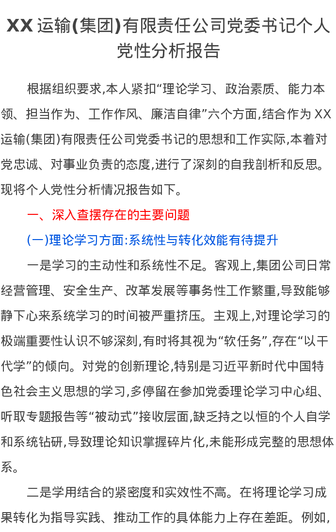 XX运输(集团)有限责任公司党委书记个人党性分析报告