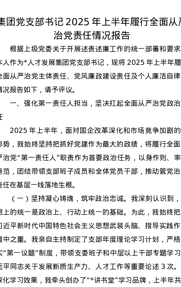 集团党支部书记2025年上半年履行全面从严治党责任情况报告