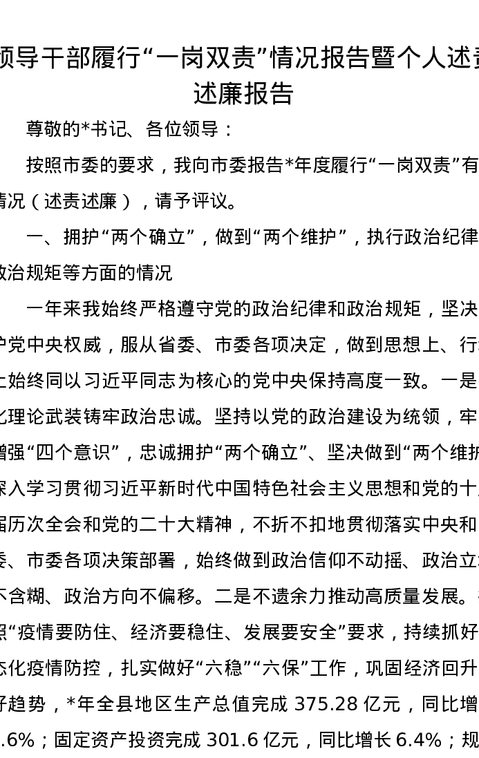 领导干部履行“一岗双责”情况报告暨个人述责述廉报告