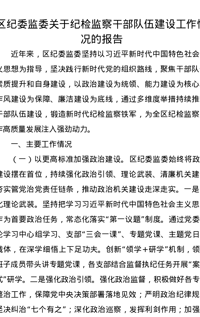 区纪委监委关于纪检监察干部队伍建设工作情况的报告