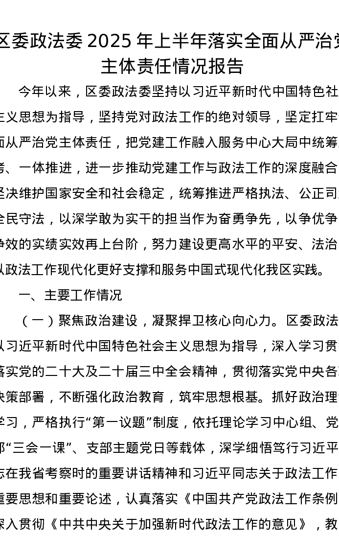 区委政法委2025年上半年落实全面从严治党主体责任情况报告