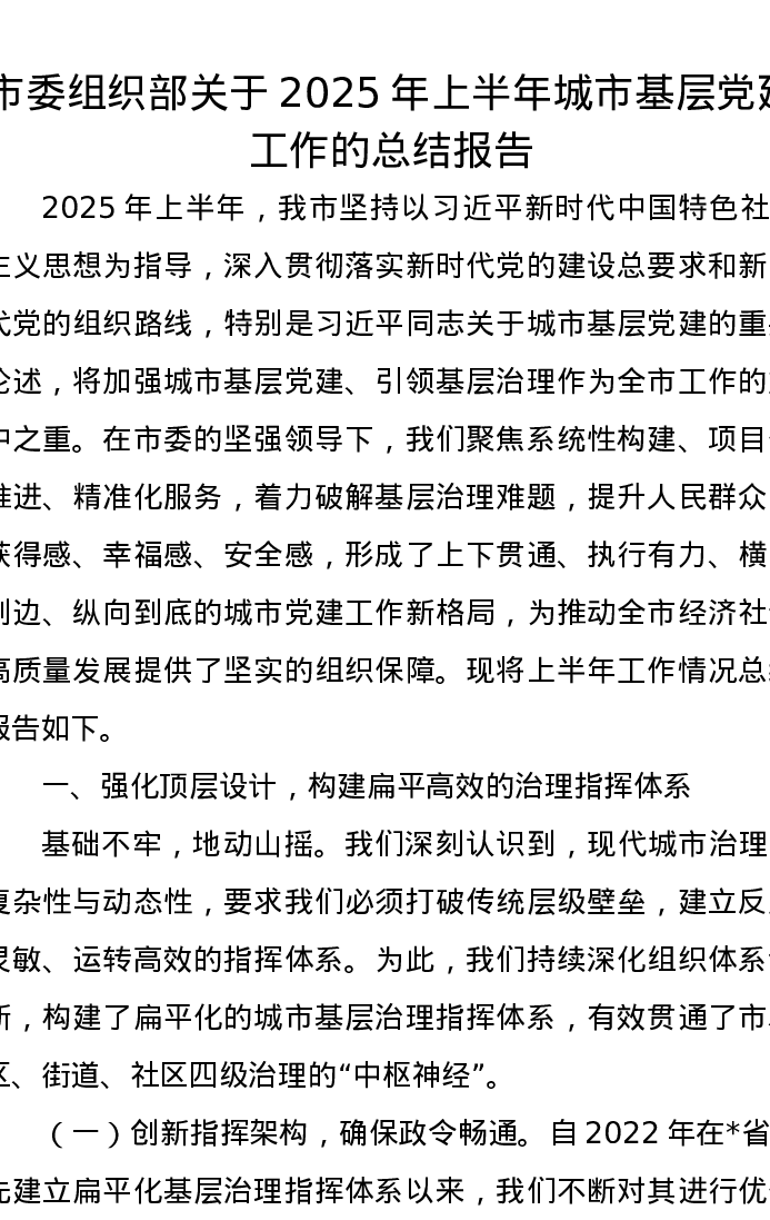 市委组织部关于2025年上半年城市基层党建工作的总结报告