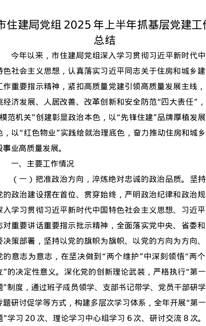 市住建局党组2025年上半年抓基层党建工作总结