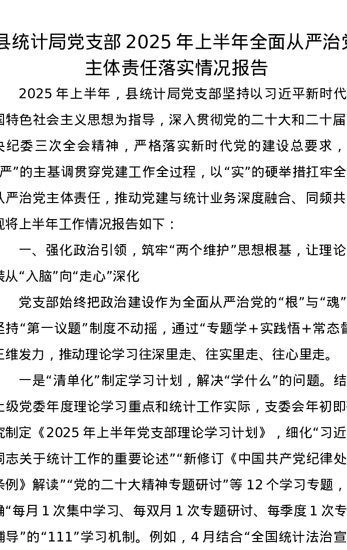 县统计局党支部2025年上半年全面从严治党主体责任落实情况报告
