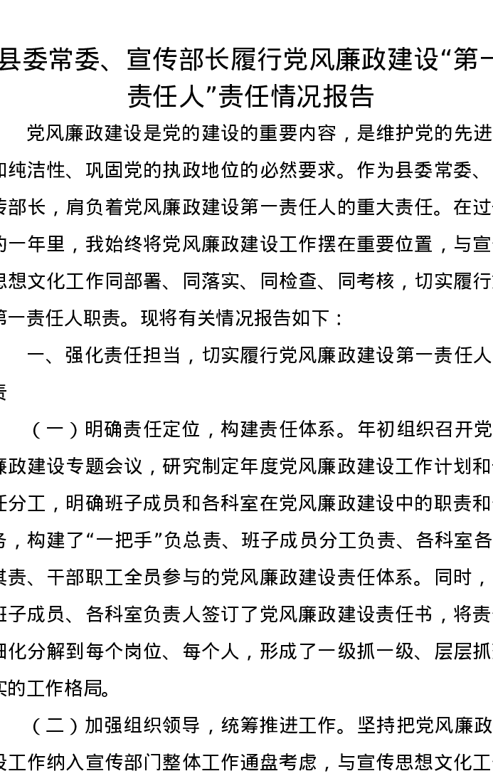 县委常委、宣传部长履行党风廉政建设“第一责任人”责任情况报告
