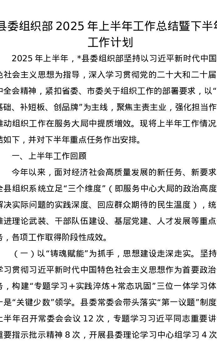 县委组织部2025年上半年工作总结暨下半年工作计划