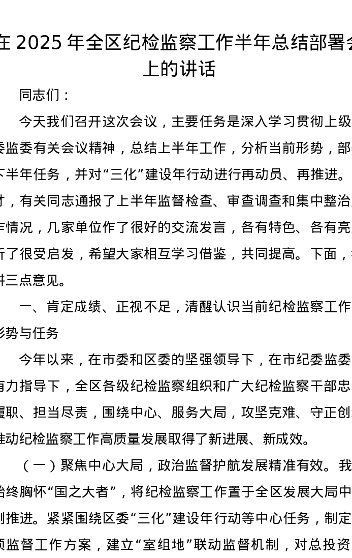 在2025年全区纪检监察工作半年总结部署会上的讲话