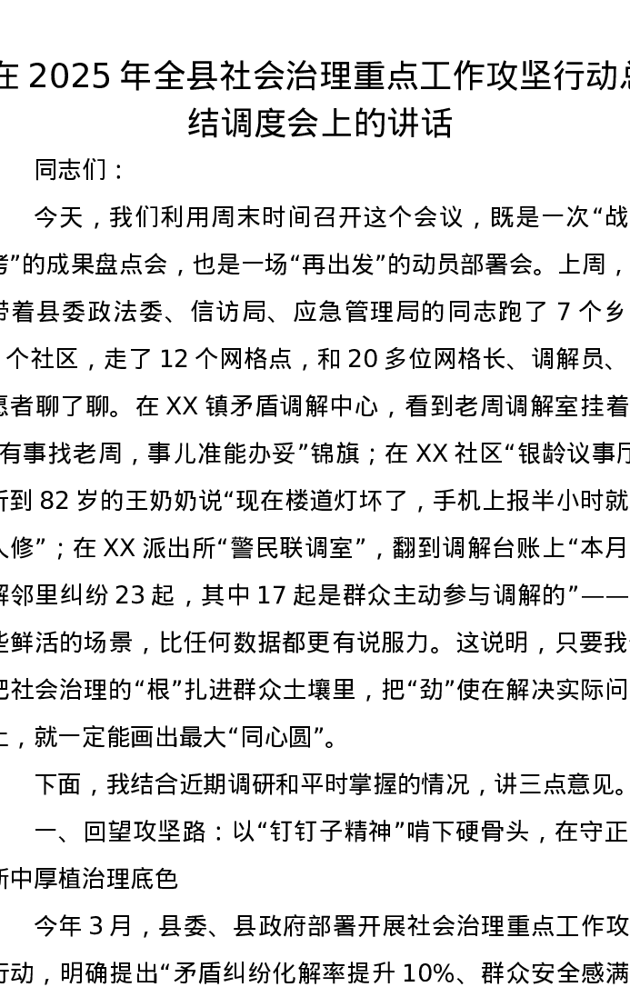 在2025年全县社会治理重点工作攻坚行动总结调度会上的讲话