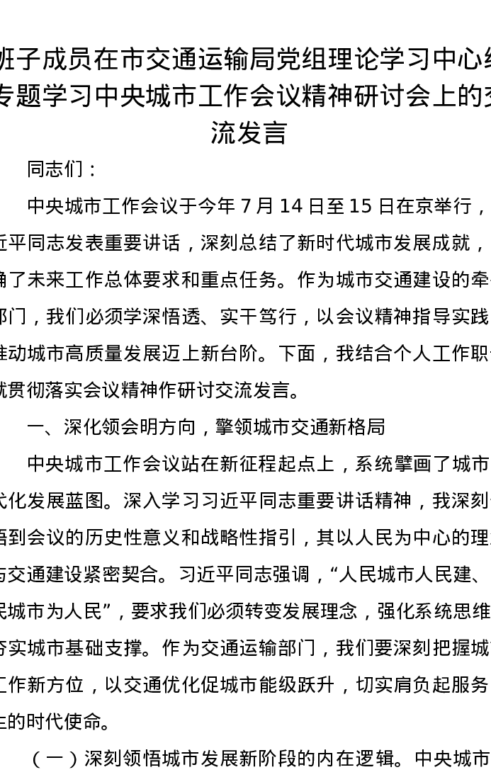 班子成员在市交通运输局党组理论学习中心组专题学习中央城市工作会议精神研讨会上的交流发言