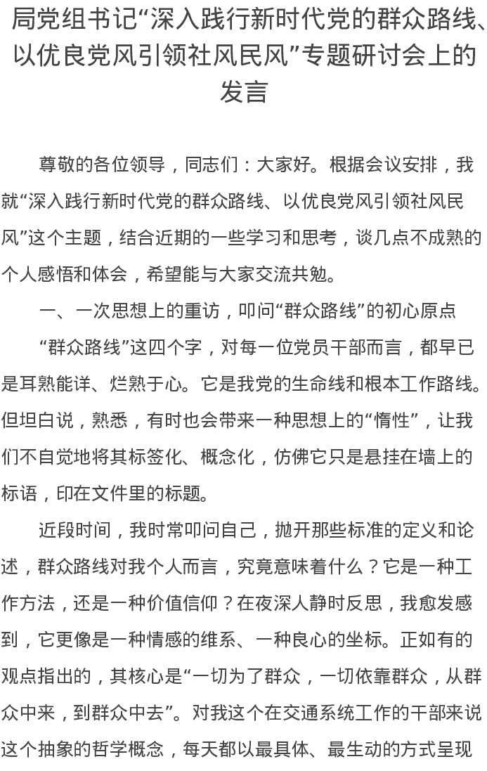 局党组书记“深入践行新时代党的群众路线、以优良党风引领社风民风”专题研讨会上的发言