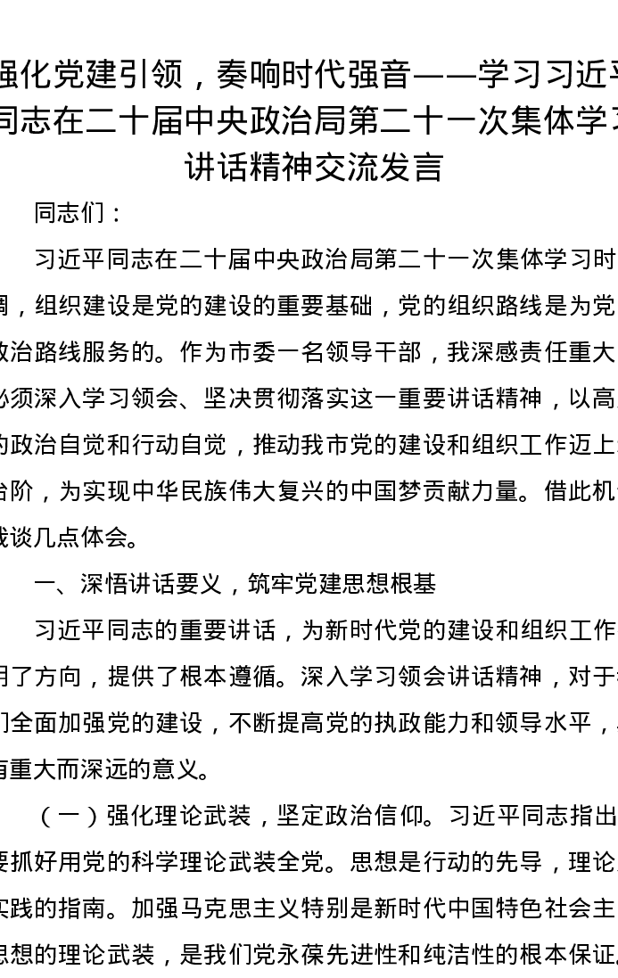 强化党建引领,奏响时代强音——学习习近平总书记在二十届中央政治局第二十一次集体学习讲话精神交流发言