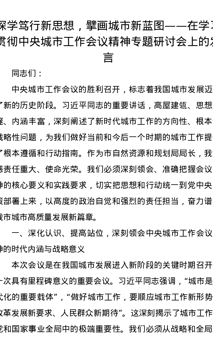 深学笃行新思想,擘画城市新蓝图——在学习贯彻中央城市工作会议精神专题研讨会上的发言