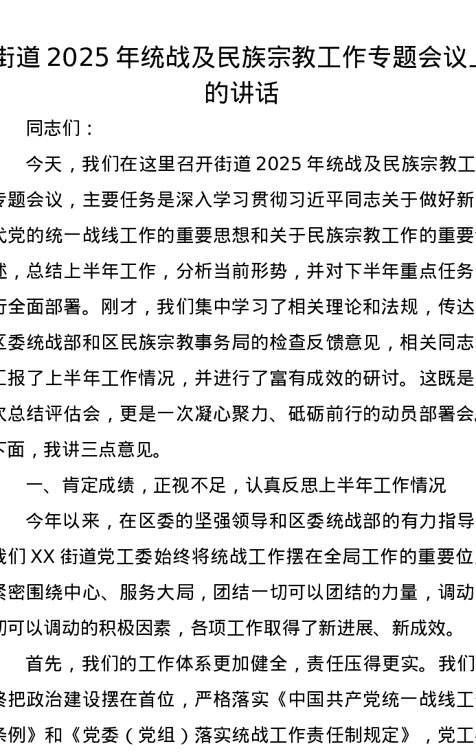 街道2025年统战及民族宗教工作专题会议上的讲话