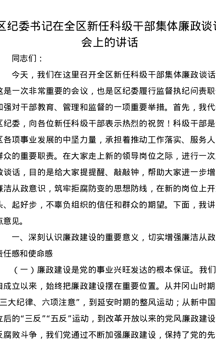区纪委书记在全区新任科级干部集体廉政谈话会上的讲话