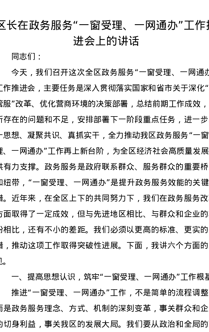 区长在政务服务“一窗受理、一网通办”工作推进会上的讲话