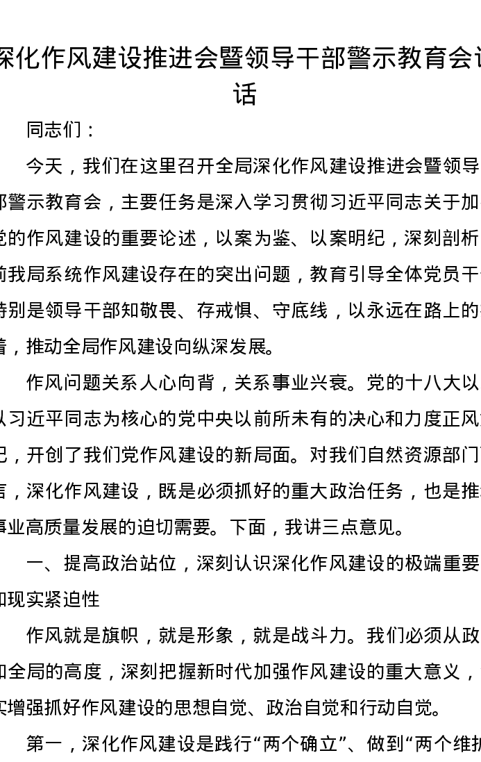 深化作风建设推进会暨领导干部警示教育会讲话