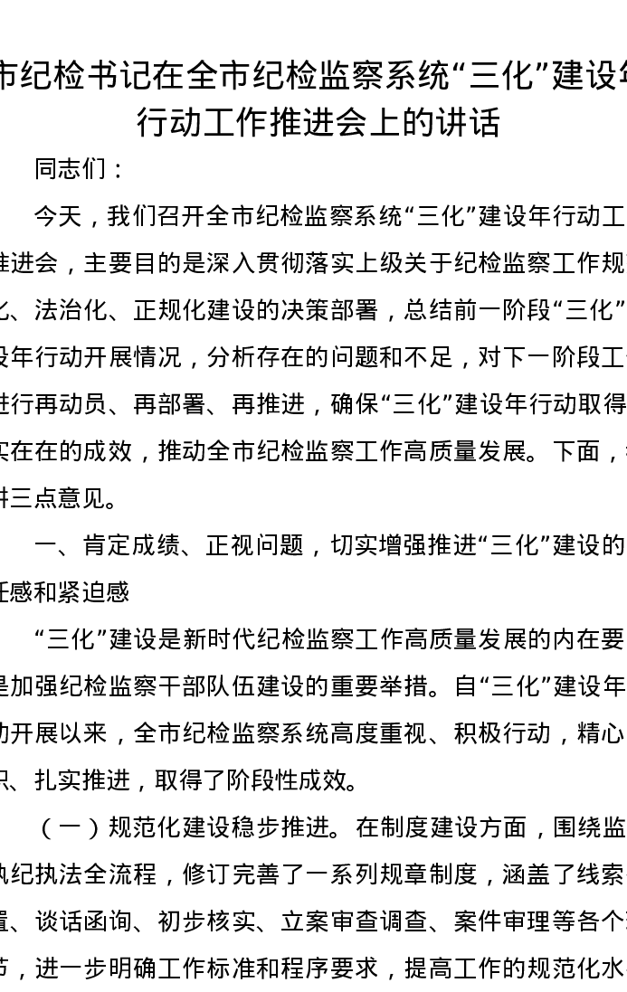 市纪检书记在全市纪检监察系统“三化”建设年行动工作推进会上的讲话