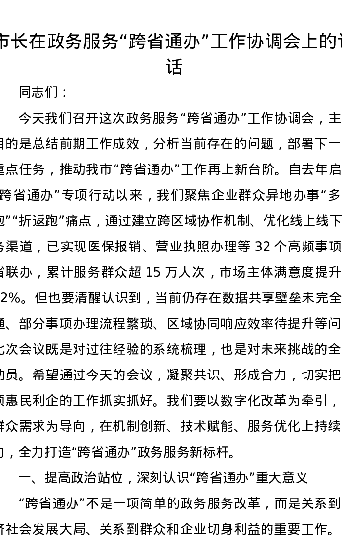 市长在政务服务“跨省通办”工作协调会上的讲话