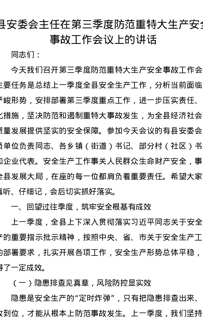县安委会主任在第三季度防范重特大生产安全事故工作会议上的讲话
