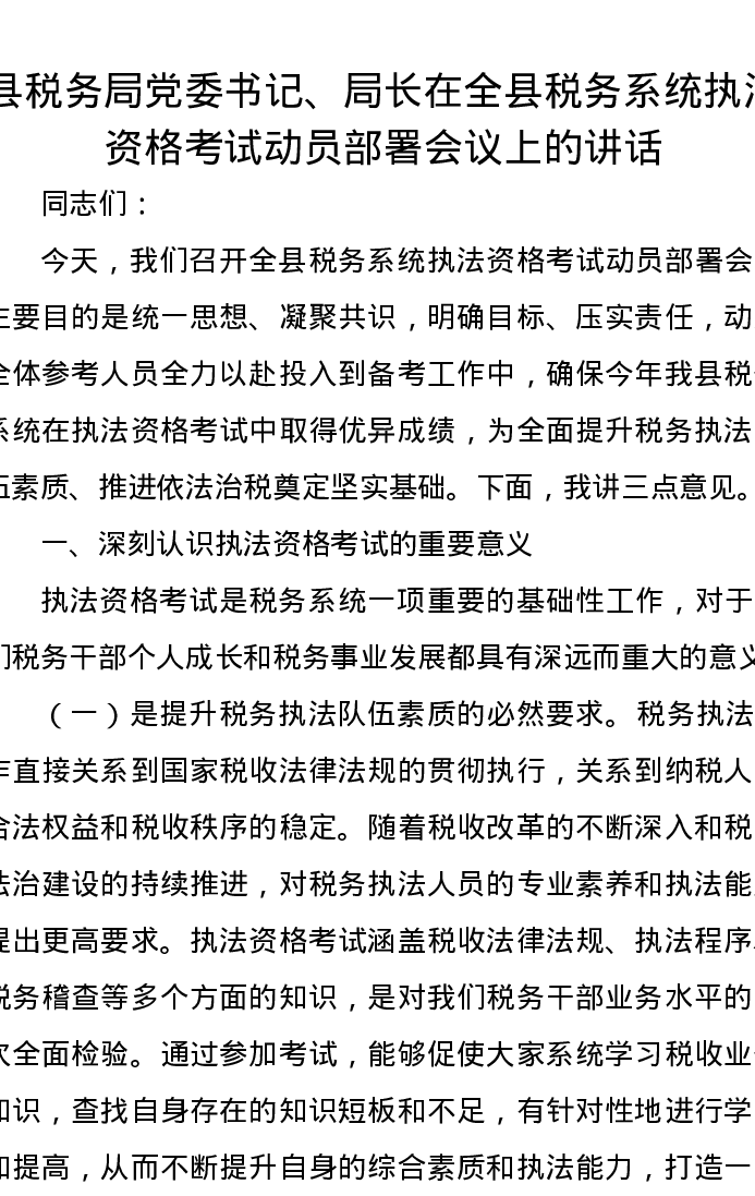 县税务局党委书记、局长在全县税务系统执法资格考试动员部署会议上的讲话
