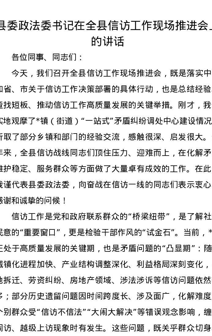 县委政法委书记在全县信访工作现场推进会上的讲话