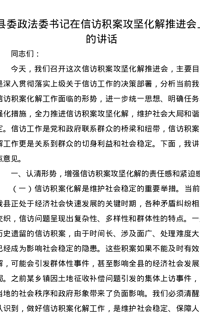 县委政法委书记在信访积案攻坚化解推进会上的讲话