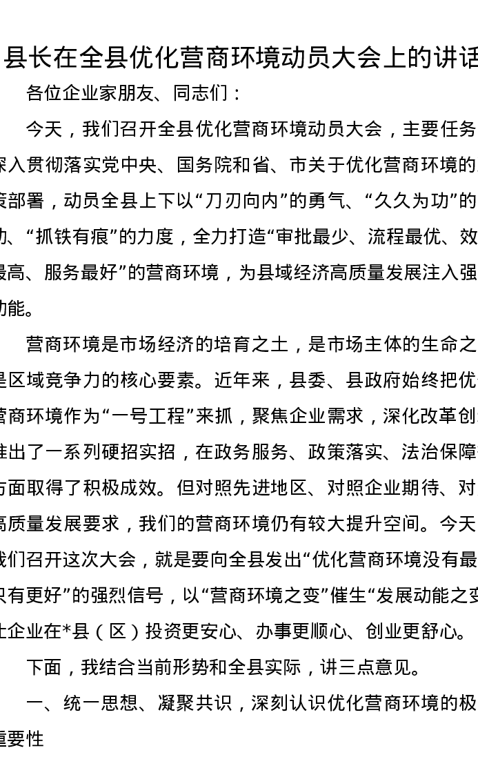 县长在全县优化营商环境动员大会上的讲话