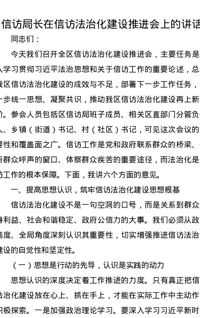 信访局长在信访法治化建设推进会上的讲话