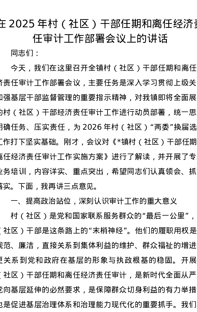 在2025年村(社区)干部任期和离任经济责任审计工作部署会议上的讲话