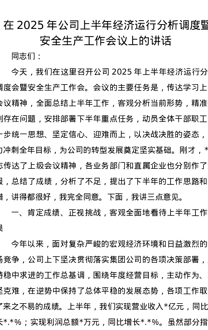 在2025年公司上半年经济运行分析调度暨安全生产工作会议上的讲话