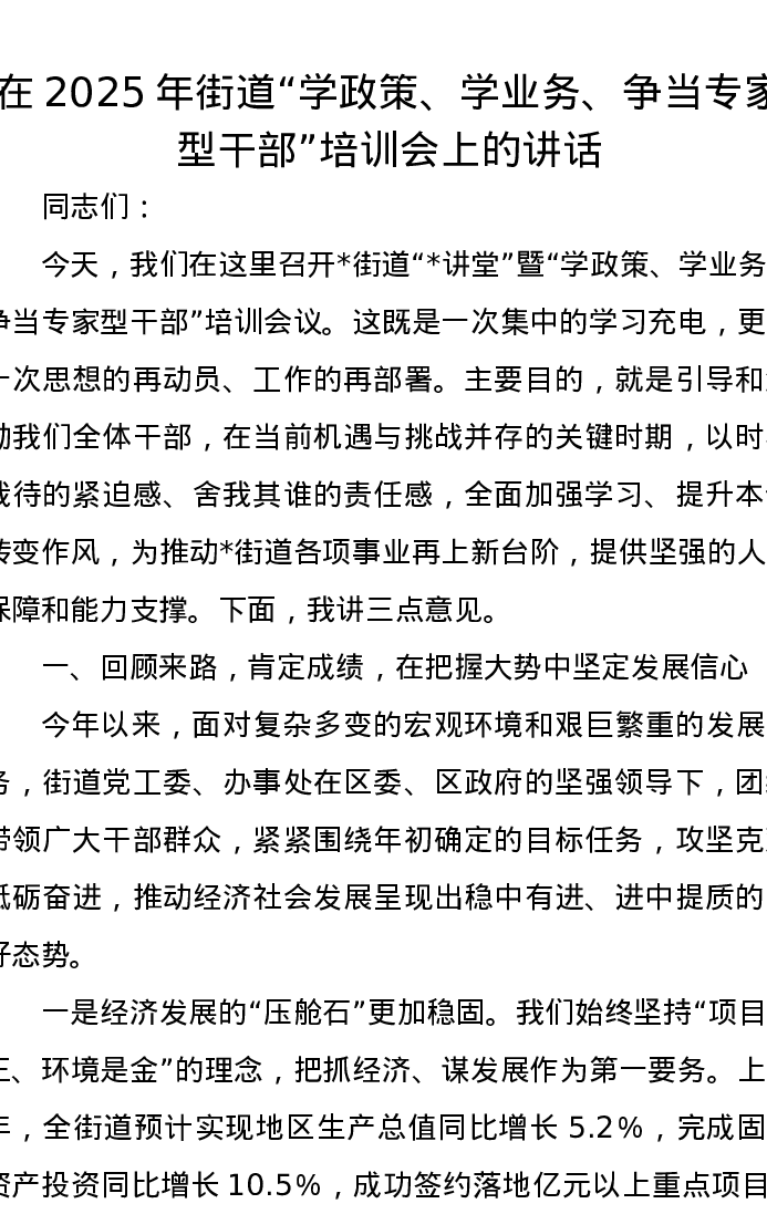 在2025年街道“学政策、学业务、争当专家型干部”培训会上的讲话