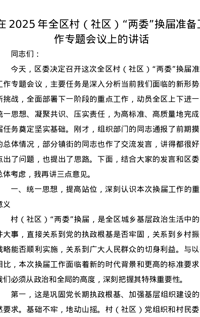 在2025年全区村(社区)“两委”换届准备工作专题会议上的讲话