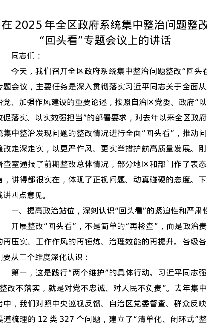 在2025年全区政府系统集中整治问题整改“回头看”专题会议上的讲话