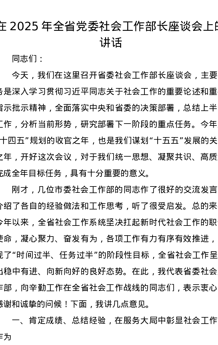 在2025年全省党委社会工作部长座谈会上的讲话