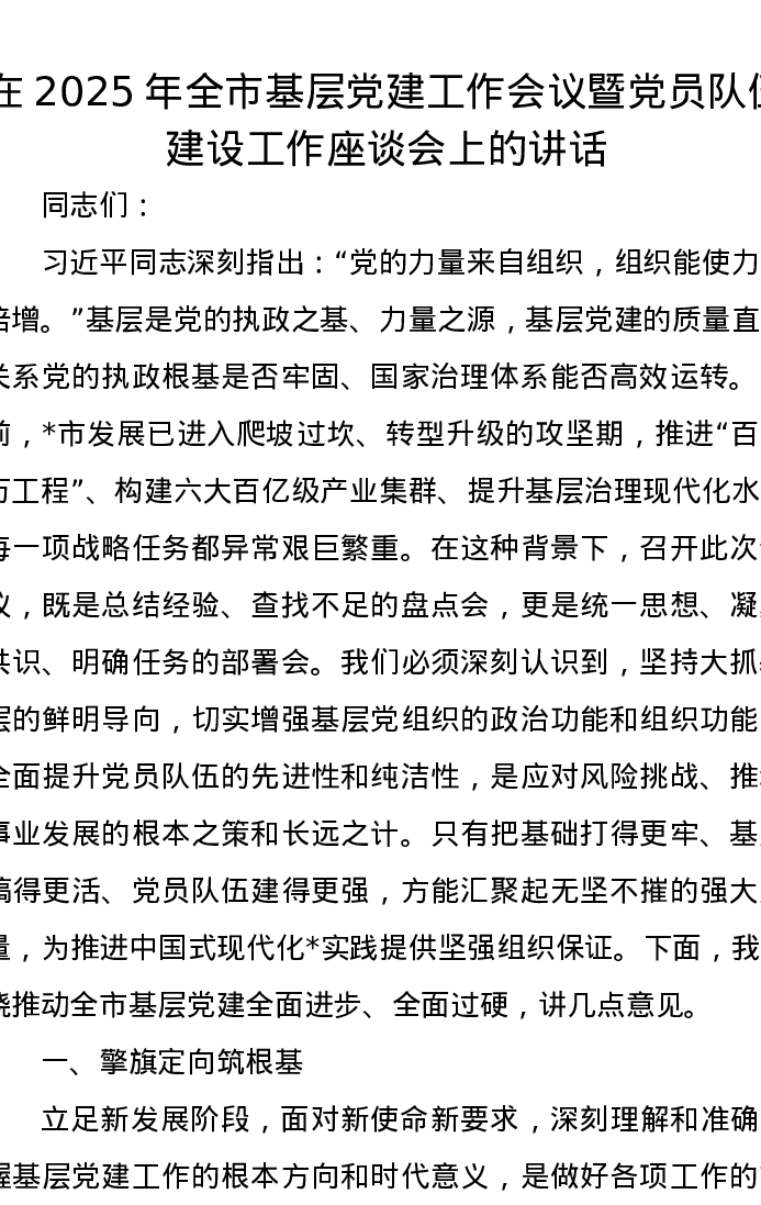 在2025年全市基层党建工作会议暨党员队伍建设工作座谈会上的讲话