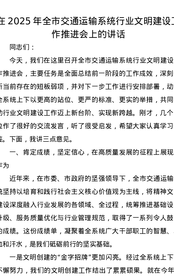 在2025年全市交通运输系统行业文明建设工作推进会上的讲话