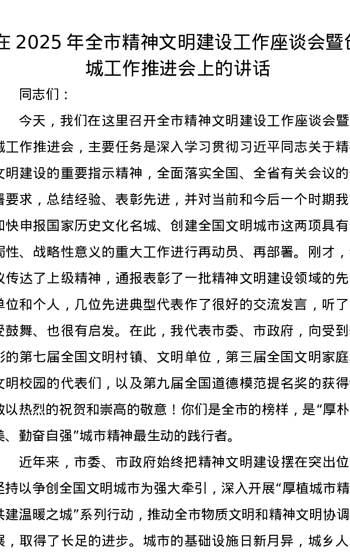 在2025年全市精神文明建设工作座谈会暨创城工作推进会上的讲话