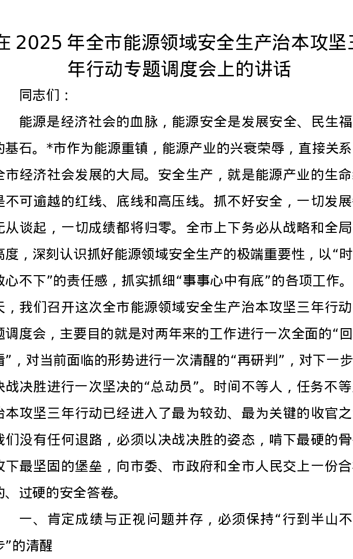 在2025年全市能源领域安全生产治本攻坚三年行动专题调度会上的讲话