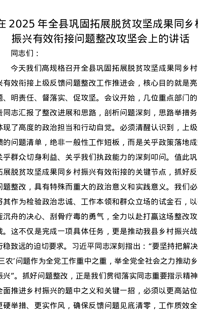 在2025年全县巩固拓展脱贫攻坚成果同乡村振兴有效衔接问题整改攻坚会上的讲话