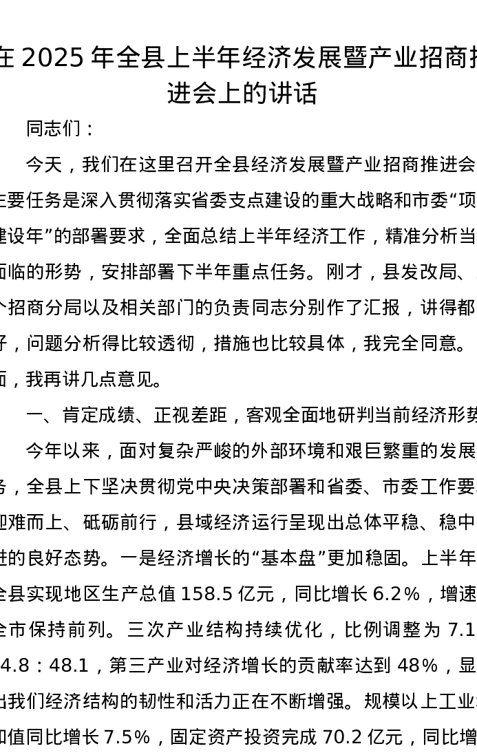 在2025年全县上半年经济发展暨产业招商推进会上的讲话