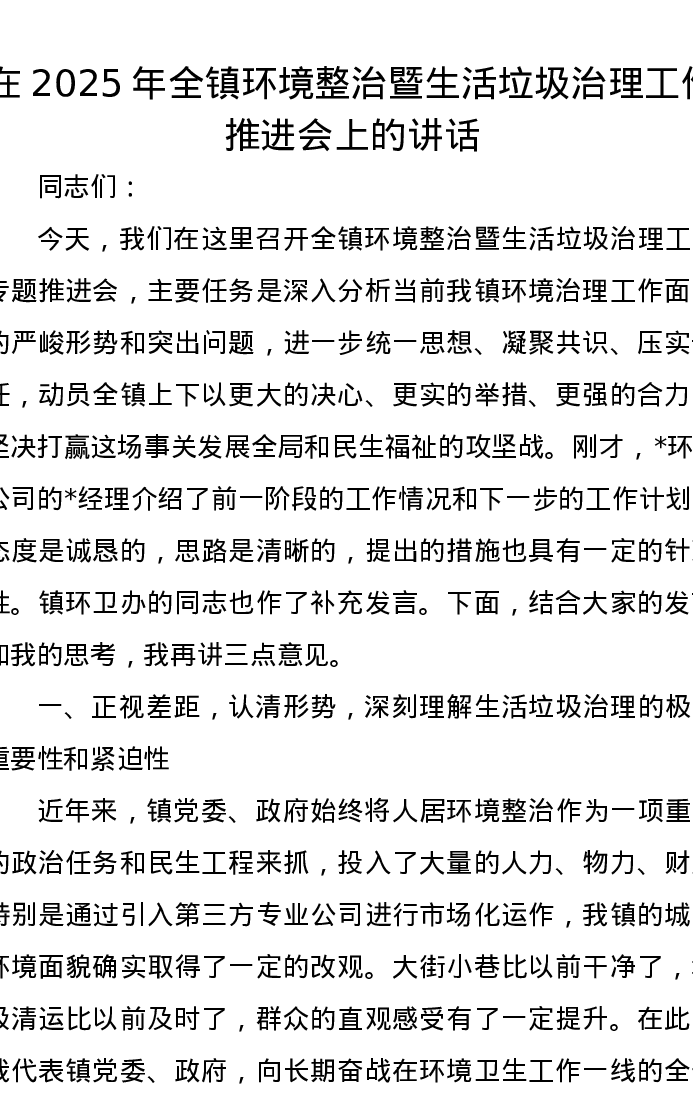 在2025年全镇环境整治暨生活垃圾治理工作推进会上的讲话