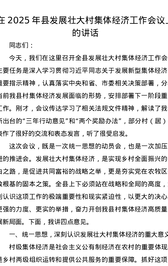 在2025年县发展壮大村集体经济工作会议上的讲话