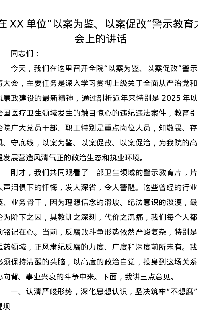 在2025年医院“以案为鉴、以案促改”警示教育大会上的讲话